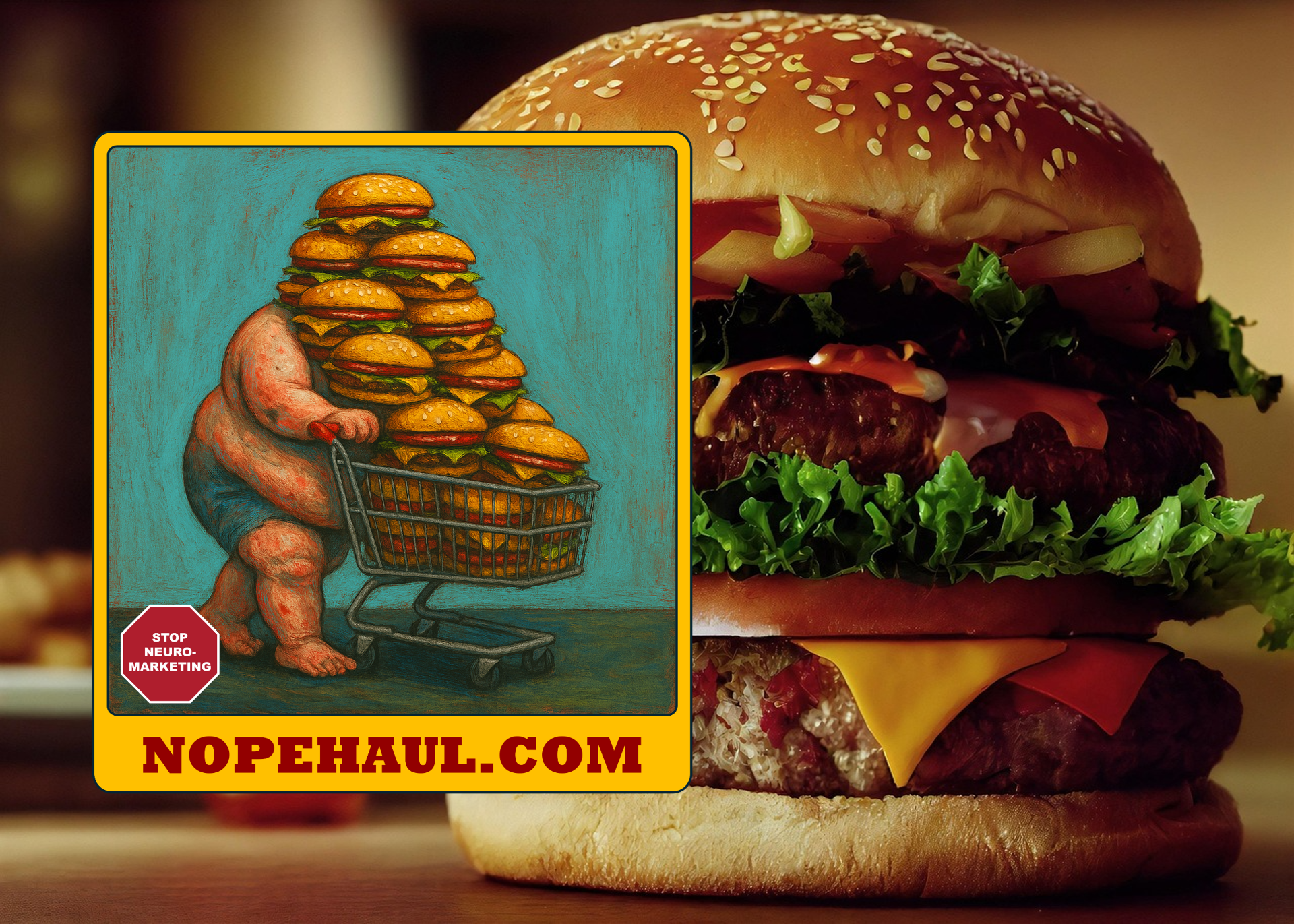 The image itself is a surreal protest: a person pushing a shopping cart overflowing with hamburgers stacked so high they tower above the shopper's head. The figure is half‑hidden behind the mountain of meat, symbolizing how consumer identity gets swallowed by excess. The clean teal background makes the chaotic cart stand out even more, and the bold NOPEHAUL.COM text at the bottom turns the artwork into a direct call to awareness.